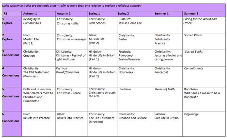 Religious Educations and Worldviews is taught through four high-dividend concepts which are woven through the curriculum and form the ‘big ideas’ through which all RE and Worldviews are taught: Belief, Community, Festivals and Worship. Explicit links are made between these concepts. Our curriculum also incorporates explicit horizontal links across a year group; vertical links where knowledge and understanding are built upon from previous units and diagonal links where meaningful links are made across the wider curriculum.