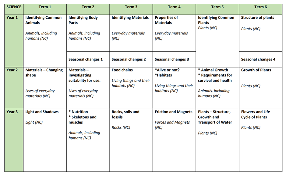 Science is taught through six high-dividend concepts which are woven through the curriculum and form the ‘big ideas’ through which all science is taught: Energy, Forces, Matter, Earth and Space, Life and Evolution. Explicit links are made between these concepts. Our curriculum also incorporates explicit horizontal links across a year group; vertical links where knowledge and understanding are built upon from previous units and diagonal links where meaningful links are made across the wider curriculum.